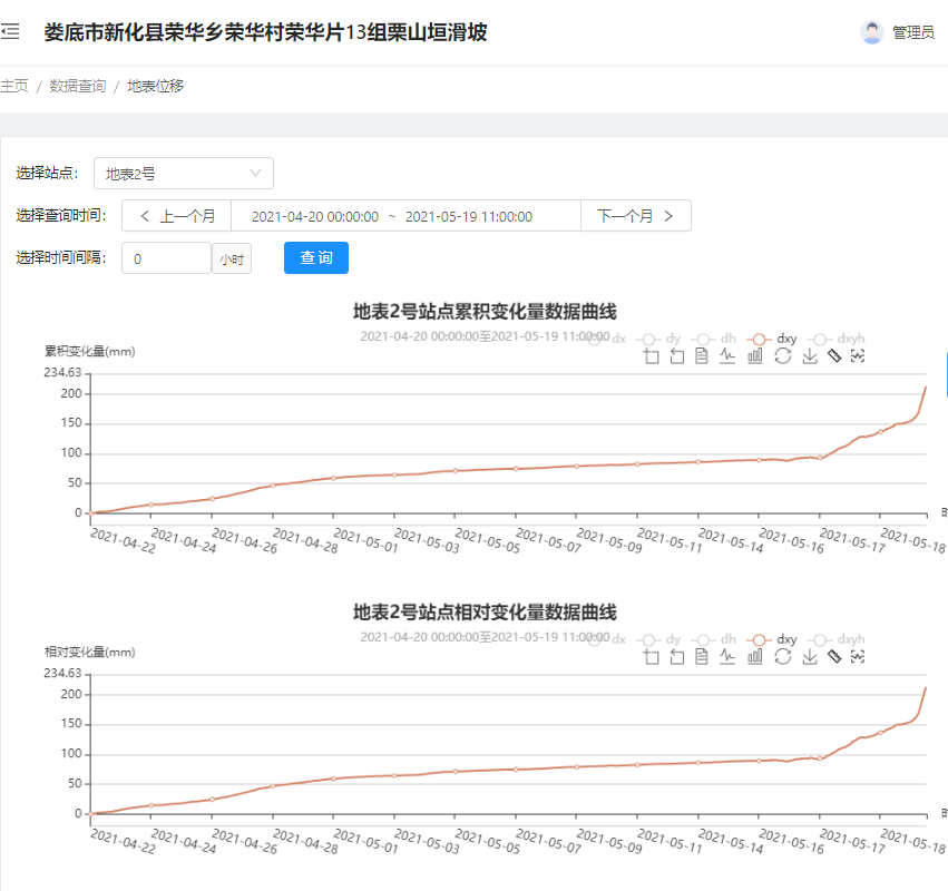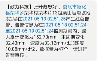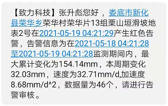 2021年05月19日凌晨,湖南省婁底市普降暴雨,其中榮華鄉(xiāng)降雨量達(dá)到85.6mm。由湖南致力工程有限科技與湖南省地質(zhì)院418隊(duì)實(shí)施的婁底市榮華鄉(xiāng)榮華村榮華片13組栗山垣滑坡地質(zhì)災(zāi)害點(diǎn),受特大暴雨影響出現(xiàn)滑坡現(xiàn)象,依托致力科技“致力云”監(jiān)測(cè)預(yù)警平臺(tái)在滑坡前約4小時(shí)發(fā)出紅色預(yù)警,預(yù)警信息自動(dòng)推送至各級(jí)主管部門并立即采取防災(zāi)避險(xiǎn)措施,及時(shí)管制道路交通,成功避免了人員傷亡、財(cái)產(chǎn)損失。這次成功預(yù)警,是致力科技繼湖南湘潭地災(zāi)項(xiàng)目、廣西樂(lè)百高速伶站服務(wù)區(qū)高邊坡滑坡等成功預(yù)警案例以來(lái),再次及時(shí)預(yù)報(bào)滑坡等自然災(zāi)害。