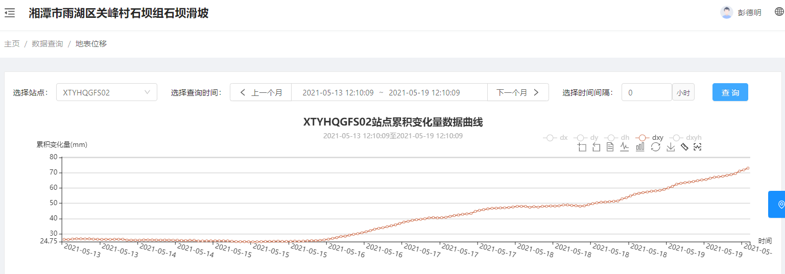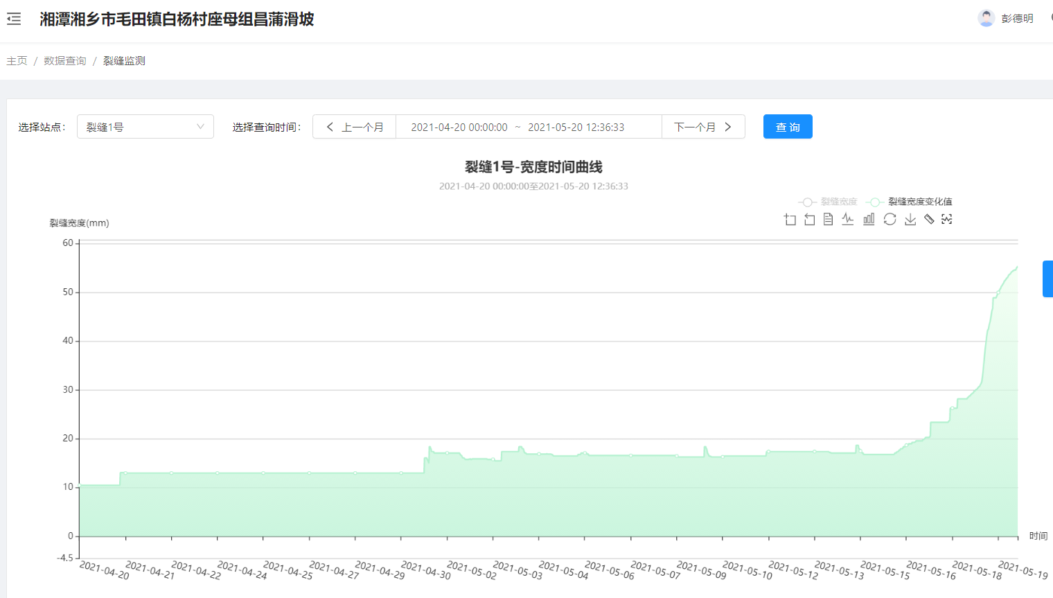 2021年5月19日14時41分系統(tǒng)觸發(fā)藍色告警,致力科技“致力云”監(jiān)測預(yù)警平臺自動捕捉到湘潭市雨湖區(qū)關(guān)峰村石壩組石壩滑坡、湘潭湘鄉(xiāng)市毛田鎮(zhèn)白楊村座母組昌蒲滑坡體上自動化專業(yè)監(jiān)測設(shè)備傳回的數(shù)據(jù)發(fā)生了變化,通過自動分析后發(fā)出藍色預(yù)警信息,并持續(xù)加強觀察。2021年5月19日17時41分監(jiān)測數(shù)據(jù)出現(xiàn)異常,系統(tǒng)觸發(fā)橙色告警,2021-05-17 17:41:54至2021-05-19 17:41:54監(jiān)測期間內(nèi),最大累計變化為86.63mm,系統(tǒng)自動發(fā)出橙色預(yù)警、告警短信到各級主管部門。