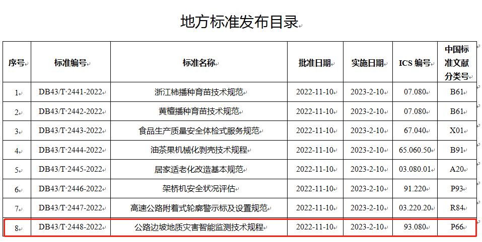 近日,由湖南致力工程科技有限公司主編,湖南省交通建設(shè)質(zhì)量安全監(jiān)督管理局、長沙市公路橋梁建設(shè)有限責(zé)任公司、中南大學(xué)、長沙理工大學(xué)、湖南省高速公路集團(tuán)有限公司、湖南省交通規(guī)劃勘察設(shè)計(jì)院有限公司、中交第三公路工程局有限公司等單位共同參與編制的《湖南省公路邊坡地質(zhì)災(zāi)害智能監(jiān)測技術(shù)規(guī)程》(DB43/T 2448-2022)(以下簡稱《規(guī)程》)經(jīng)湖南省市場監(jiān)督管理局批準(zhǔn)發(fā)布,自2023年2月10日施行。