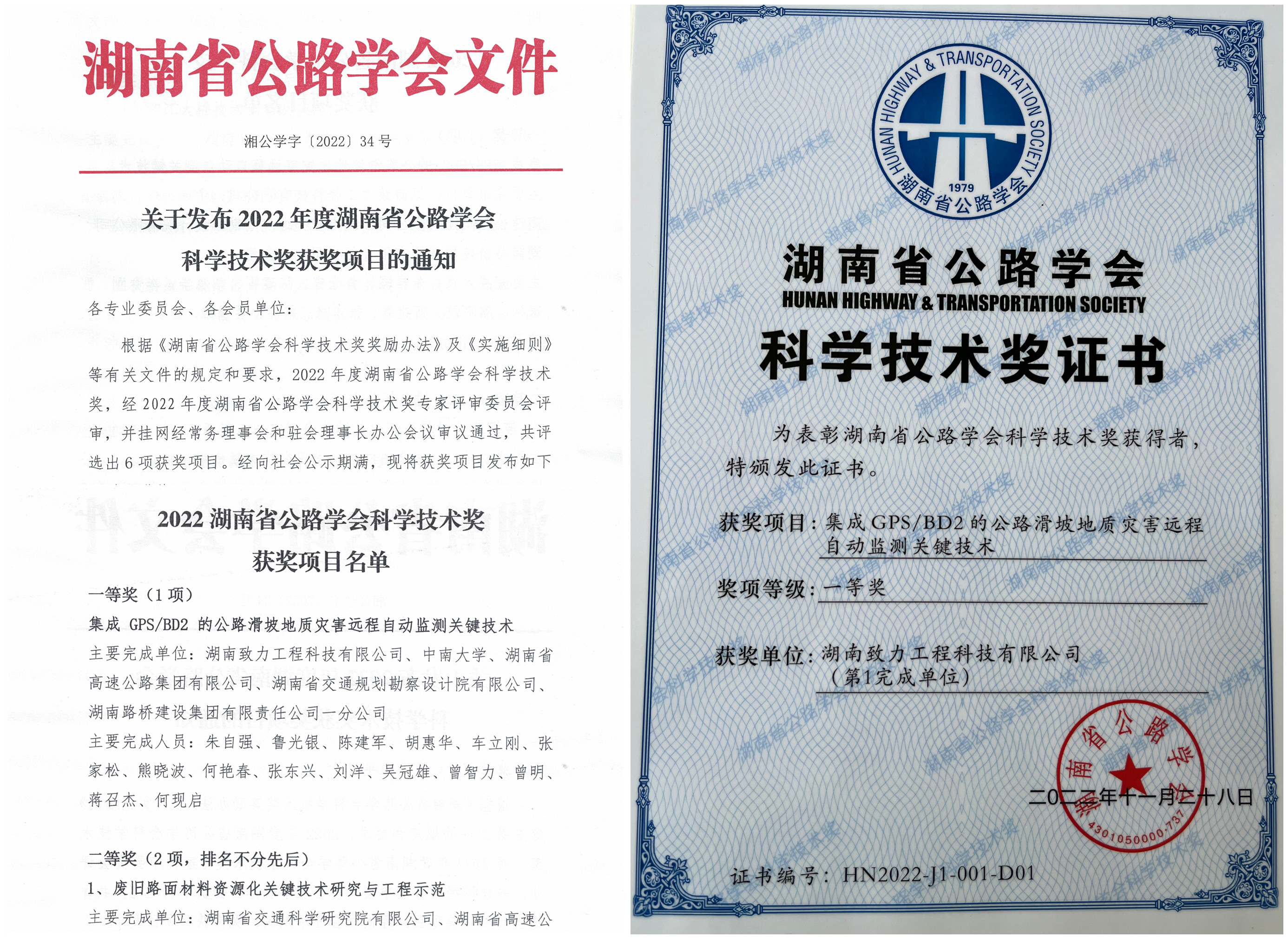 近日,湖南省公路學(xué)會(huì)“第八屆八次理事會(huì)暨2022年學(xué)術(shù)年會(huì)”在長(zhǎng)沙召開(kāi),會(huì)議對(duì)2022年度湖南省公路學(xué)會(huì)科學(xué)技術(shù)獎(jiǎng)獲獎(jiǎng)項(xiàng)目、先進(jìn)工作者和十佳優(yōu)秀青年科技人才進(jìn)行了表彰。湖南致力工程科技有限公司聯(lián)合中南大學(xué)、湖南省高速公路集團(tuán)有限公司、湖南省交通規(guī)劃勘察設(shè)計(jì)院有限公司、湖南路橋建設(shè)集團(tuán)有限責(zé)任公司一分公司完成的“集成GPS/BD2的公路滑坡地質(zhì)災(zāi)害遠(yuǎn)程自動(dòng)監(jiān)測(cè)關(guān)鍵技術(shù)”研究成果榮獲湖南省公路學(xué)會(huì)科學(xué)技術(shù)獎(jiǎng)一等獎(jiǎng)。
