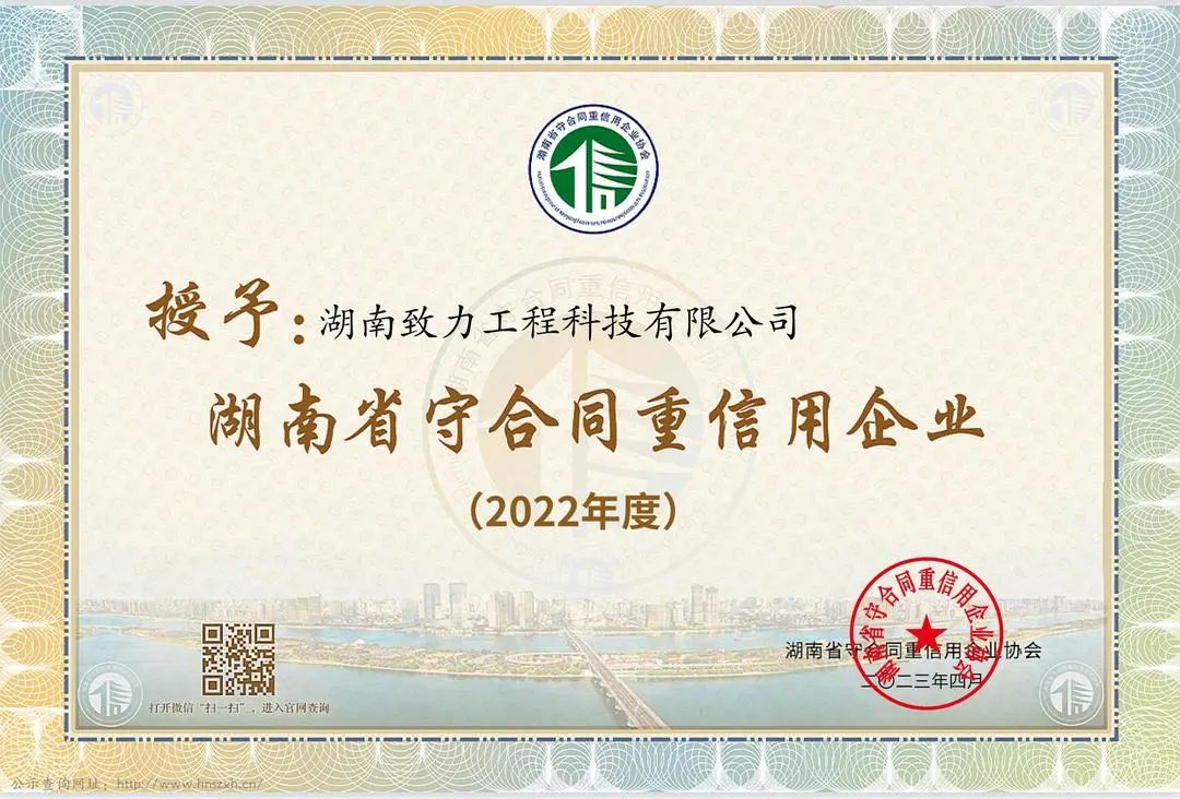 NEWS近日,湖南省市場監(jiān)督管理局公示了2022年度“守合同重信用”企業(yè)名單,湖南致力工程科技有限公司獲評湖南省年度 “守合同重信用”企業(yè)和長沙市年度 “守合同重信用”企業(yè),這也是公司連續(xù)5年獲此榮譽。榮獲該項殊榮,代表著政府主管部門及社會各界對我司在誠信經(jīng)營、合同履約以及企業(yè)信用體系建設(shè)等方面的充分肯定與高度認(rèn)可。