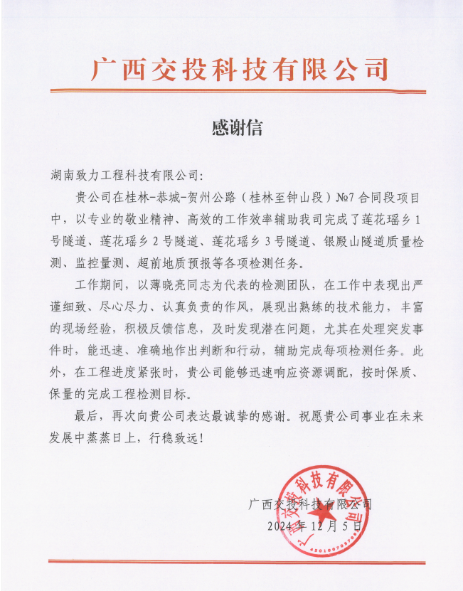 近日,湖南致力工程科技有限公司隧道檢測駐地項(xiàng)目部接連收到2封感謝信!信中指出,致力科技團(tuán)隊(duì)專業(yè)技術(shù)精湛、經(jīng)驗(yàn)豐富,工作中秉持嚴(yán)謹(jǐn)細(xì)致、認(rèn)真負(fù)責(zé)的態(tài)度,能準(zhǔn)確且高效地完成隧道質(zhì)量檢測、監(jiān)控量測、超前地質(zhì)預(yù)報(bào)等各類工作任務(wù)。