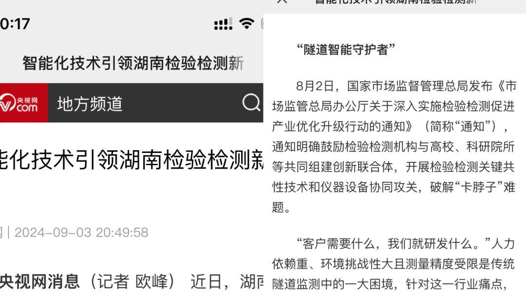 CCTV央視網(wǎng)地方頻道專題報(bào)道智能化技術(shù)引領(lǐng)湖南檢驗(yàn)檢測(cè)新未來(lái),湖南致力工程科技有限公司自主研發(fā)的隧道智能監(jiān)測(cè)系統(tǒng)引起廣泛關(guān)注!